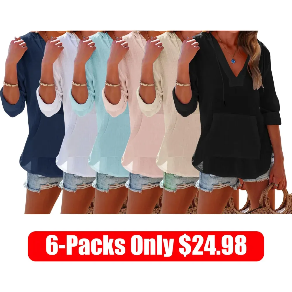 🔥2025 Hot Trend🔥Women's Oversized Hooded Beach Cover Up - Long Sleeve V-Neck Pocket Shirt
