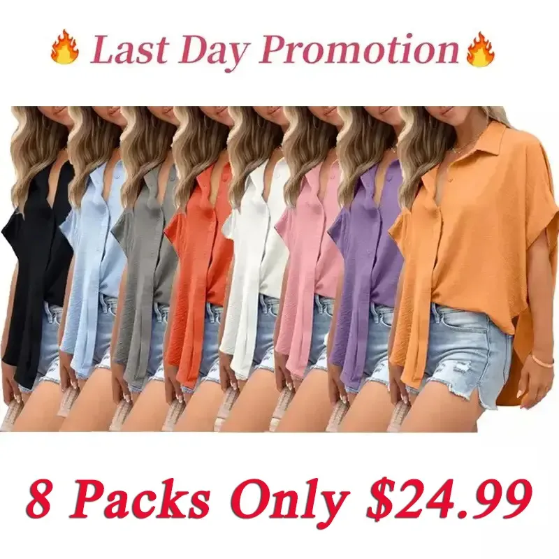 Women's Casual Button Short Sleeve Slit Hem Shirt Solid Color Tops